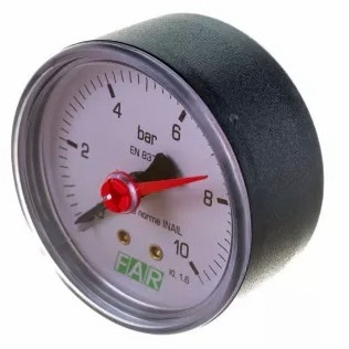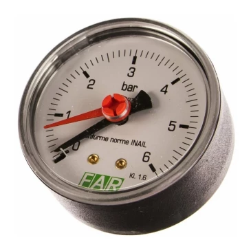 Аксильный манометр FAR 6 бар предназначен для измерения давления в газообразных и жидких средах, не агрессивных по отношению к медным сплавам в системах отопления и водоснабжения.